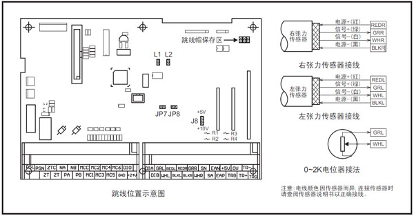 [3]在浮輥式張力系統中,當選用的角度傳感器為0~2KΩ點位器時,請將控制板上的跳線L1短接(為點位器提供恒流源),JP7,JP8短接。