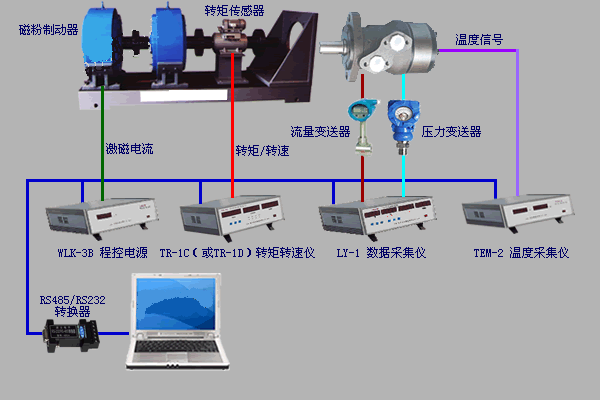 - 系統(tǒng)通過1臺相位差式轉(zhuǎn)矩轉(zhuǎn)速傳感器及1臺TR-1C轉(zhuǎn)矩轉(zhuǎn)速采集儀(或TR-1D轉(zhuǎn)矩轉(zhuǎn)速采集儀)采集馬達(dá)的輸出轉(zhuǎn)矩和轉(zhuǎn)速;用1臺LY-1型數(shù)據(jù)采集儀采集流量和壓力;用1臺TEM-2溫度采集儀檢測溫升;用WLK-3B程控電源控制磁粉制動(dòng)器對馬達(dá)進(jìn)行加載。