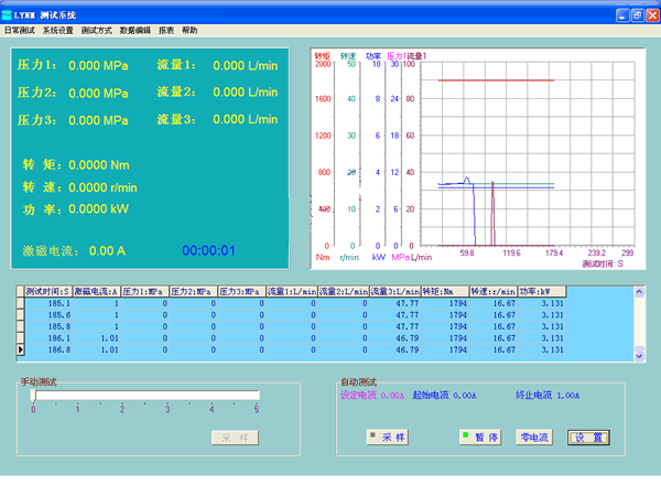 液壓馬達(dá)測試系統(tǒng)采用磁粉制動(dòng)器作加載器;采用磁電型扭矩傳感器測量液壓馬達(dá)、氣壓馬達(dá)、氣動(dòng)馬達(dá)的輸出轉(zhuǎn)矩轉(zhuǎn)速;采用流量變送器測量流量;采用壓力變送器測量液壓(氣壓);采用數(shù)字溫度傳感器測量溫度。